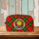 Clan Kerr crest badge surrounded by a strap and buckle over tartan background. Custom text on both sides.