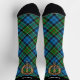 Clan Kirkpatrick crest badge surrounded by a strap and buckle over tartan background. Custom top stripe color. Custom text on each sock.