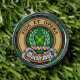 Clan MacArthur crest badge surrounded by a strap and buckle over tartan background. Custom text.