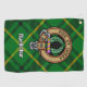 Clan MacArthur crest badge surrounded by a strap and buckle over tartan background. Custom text.