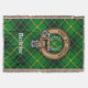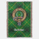 Clan MacArthur crest badge surrounded by a strap and buckle over tartan background. Custom text.