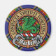 Clan MacBeth crest badge surrounded by a strap and buckle over tartan background. Custom text.