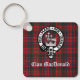 Square keychain with Scottish Clan MacDonald crest badge on red modern clan tartan background.