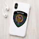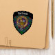 Clan MacDonald crest badge surrounded by a strap and buckle over tartan background. Custom text.