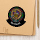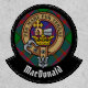 Clan MacDonald crest badge surrounded by a strap and buckle over tartan background. Custom text.