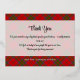 Clan MacDonald of Keppoch crest badge surrounded by a strap and buckle over tartan background. Foil printed thank you card. Custom text.