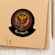 Clan MacDonald of Keppoch crest badge surrounded by a strap and buckle over tartan background. Custom text.