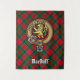 Clan MacDuff crest badge surrounded by a strap and buckle over tartan background. Custom text.