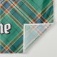 Clan MacFarlane crest badge surrounded by a strap and buckle over ancient hunting tartan background. Custom text.