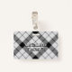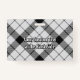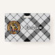 Clan MacFarlane crest badge surrounded by a strap and buckle over black and white tartan background. Custom text on both sides.
