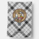 Clan MacFarlane crest badge surrounded by a strap and buckle over black and white tartan background. Custom text.