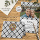 Clan MacFarlane crest badge surrounded by a strap and buckle over black and white tartan background. Thank you card. Custom photograph. Custom text fields on both sides.