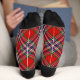 Clan MacFarlane crest badge surrounded by a strap and buckle over red tartan background. Custom top stripe color. Custom text on each sock.