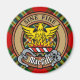 Clan MacGill crest badge surrounded by a strap and buckle over tartan background. Custom text.