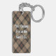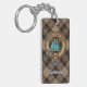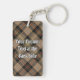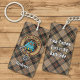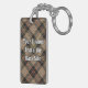 Clan MacKenzie crest badge surrounded by a strap and buckle over brown hunting tartan background. Custom text on both sides.