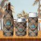 Clan MacKenzie crest badge surrounded by a strap and buckle over brown hunting tartan background. Custom text.