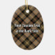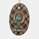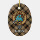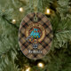 Clan MacKenzie crest badge surrounded by a strap and buckle over brown hunting tartan background. Custom text on both sides.