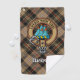 Clan MacKenzie crest badge surrounded by a strap and buckle over brown hunting tartan background. Custom text.