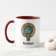 Clan MacKenzie crest badge surrounded by a strap and buckle over brown hunting tartan background. Custom text on both sides.