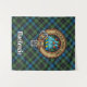 Clan MacKenzie crest badge surrounded by a strap and buckle over tartan background. Custom text.