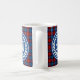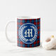 Coffee mug in the tartan for Clan MacLachlan and its septs, including Lachie and MacGilchrist, a traditional Scottish plaid in royal blue and bright red with green and black accents. Vintage pattern from 1831. Both sides of mug feature your monogram initial in an Old English font inside a round royal blue badge with laurels.