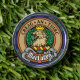 Clan MacLaren crest badge surrounded by a strap and buckle over tartan background. Custom text.
