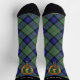 Clan MacLaren crest badge surrounded by a strap and buckle over tartan background. Custom top stripe color. Custom text on each sock.