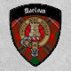 Clan MacLean crest badge surrounded by a strap and buckle over tartan background. Custom text.
