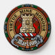 Clan MacLean crest badge surrounded by a strap and buckle over tartan background. Custom text.