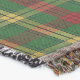 Colorful custom fringe end throw blanket made with graphics of the red, green, and yellow traditional Scottish clan MacMillan tartan plaid pattern. Khaki tan old world style text can be personalized to read what you want. Lovely gift idea for anyone.