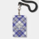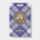 Clan MacPherson crest badge surrounded by a strap and buckle over blue dress tartan background. Custom text.