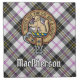 Clan MacPherson crest badge surrounded by a strap and buckle over dress tartan background. Custom text.