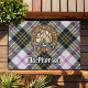 Clan MacPherson crest badge surrounded by a strap and buckle over dress tartan background. Custom text.