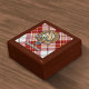 This product is made with beautiful mahogany wood, the inside is lined with white satin. The hinges are very sturdy and keeps a tight close on the box. The pattern tile is wonderful It's truly is an exquisite product. This is a gift for anyone and for any occasion. A fine wooden piece to display on your furniture anywhere in your home. The printing accented the design on the box very well. Very pleased with the Font.