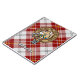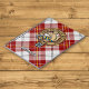 Clan MacPherson crest badge surrounded by a strap and buckle over red dress tartan background. Custom text.