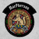 Clan MacPherson crest badge surrounded by a strap and buckle over tartan background. Custom text.