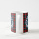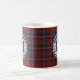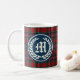 Coffee mug with the tartan for Clan MacPherson and its septs, including Clark and Smith, a colorful Scottish plaid in bright red, navy blue and green, with yellow, white and black accents. Vintage pattern dated to 1822. Both sides of mug feature a round navy blue badge with laurels and your monogram initial in an Old English font.