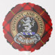 Clan MacQueen crest badge surrounded by a strap and buckle over tartan background. Custom text on both sides.