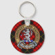Clan MacQueen crest badge surrounded by a strap and buckle over tartan background. Custom text on both sides.