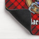 Clan MacQueen crest badge surrounded by a strap and buckle over tartan background. Custom text.