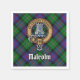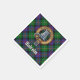 Clan Malcolm or MacCallum crest badge surrounded by a strap and buckle over tartan background. Custom text.