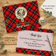 Clan Marjoribanks crest badge surrounded by a strap and buckle over tartan background. Foil printed thank you card. Custom text.