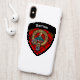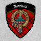 Clan Morrison crest badge surrounded by a strap and buckle over red tartan background. Custom text.