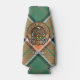 Clan Pollock crest badge surrounded by a strap and buckle over tartan background. Custom text.