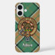 Clan Pollock crest badge surrounded by a strap and buckle over tartan background. Custom text.