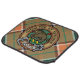 Clan Pollock crest badge surrounded by a strap and buckle over tartan background. Custom text.