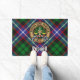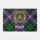 Clan Russell crest badge surrounded by a strap and buckle over tartan background. Custom text.