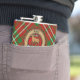 Clan Scott crest badge surrounded by a strap and buckle over red tartan. Custom text.