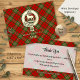 Clan Scott crest badge surrounded by a strap and buckle over red tartan background. Foil printed thank you card. Custom text.
