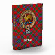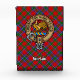 Clan Sinclair crest badge surrounded by a strap and buckle over tartan background. Custom text.